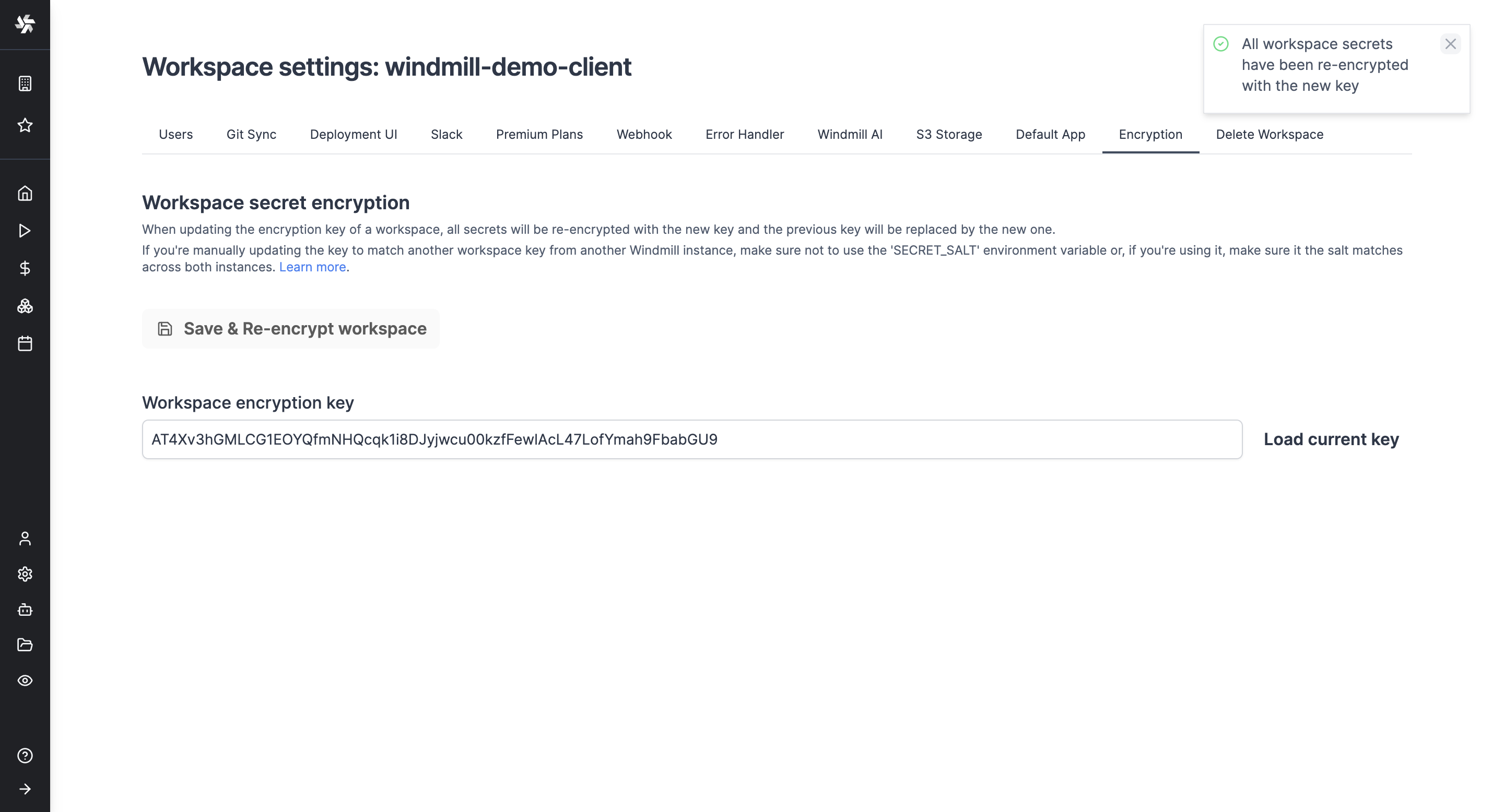 All secrets of a workspace are encrypted with a symmetric key unique to that workspace. This key is generated when the workspace is created and is stored in the database in the workspace_settings. You can now manually update the encryption key of a workspace, it will be re-encrypted with the new key and the previous key will be replaced by the new one.